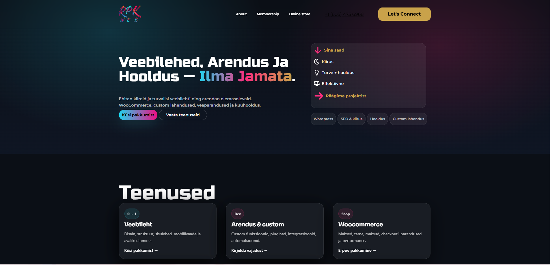 WooCommerce, custom lahendused, veaparandused ja kuuhooldus.